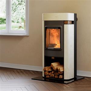 De Elisabeth is bekleed met een natuursteenmantel (speksteen of velvet Ivory), die zorgt voor extra lange warmteopslag en een aangename warmteafgifte, ook ná het stoken. Het geïntegreerde houten handvat blijft altijd koel voor een comfortabel gebruik.