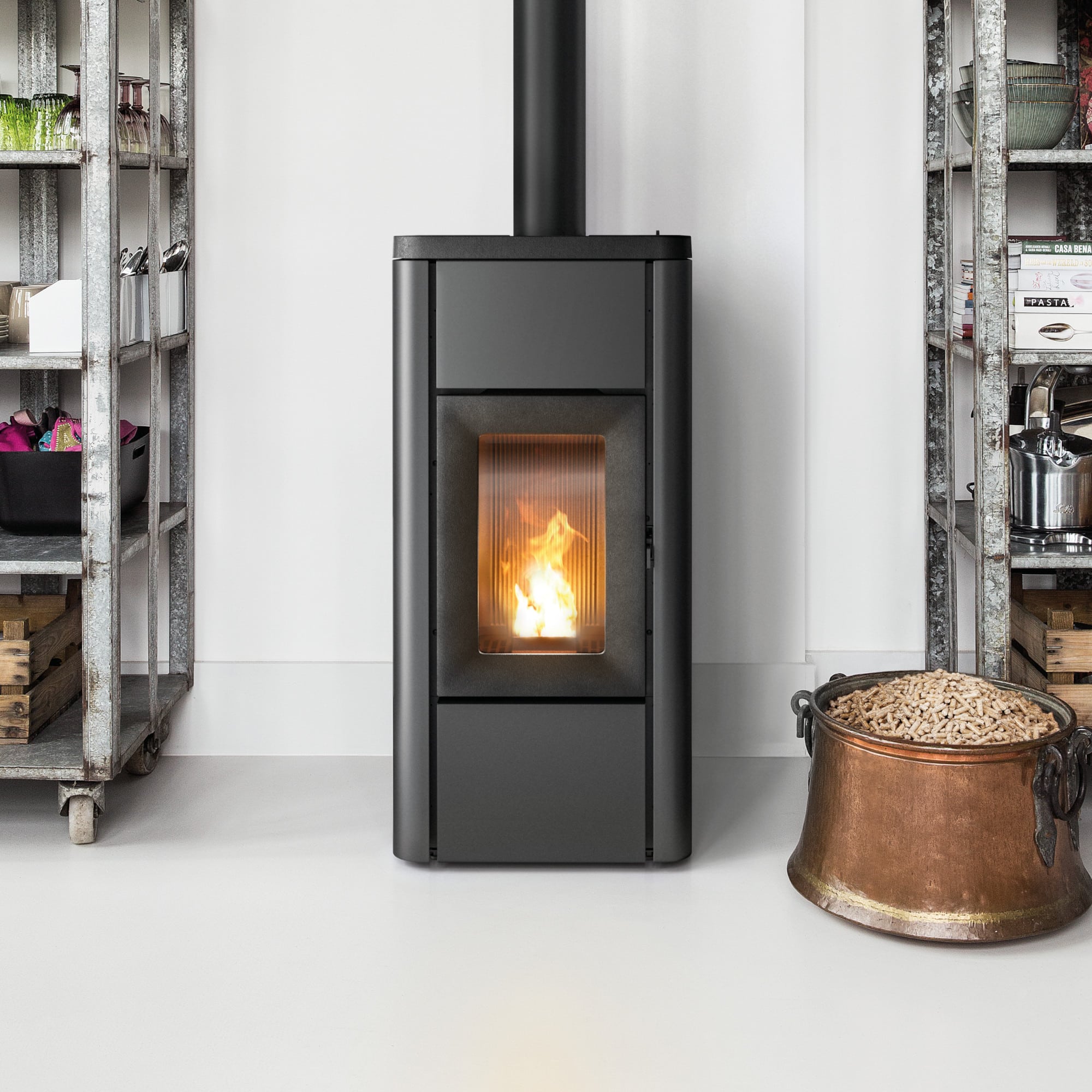 De MCZ Ghea easy is een eenvoudige pelletkachel die in elk interieur past. Met 6 kW is de Ghea uitermate geschikt voor kleinere ruimtes. De deur, het bovenblad en het interieur zijn vervaardigd uit gietijzer, de zijkanten uit plaatstaal in de kleur zwart.
