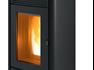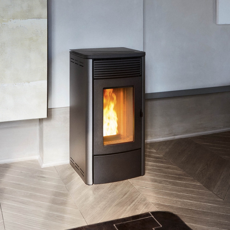 De Tecla is een pelletkachel met een modern uiterlijk, een gietijzeren voor- en bovenzijde en stalen panelen in de kleur zwart.